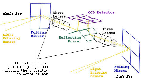 In this image, we see the path of light entering the camera. The entire filter wheel is not pictured in this diagram, but the black lines indicate where filters (the gray circles) would block out all light except certain wavelengths. |