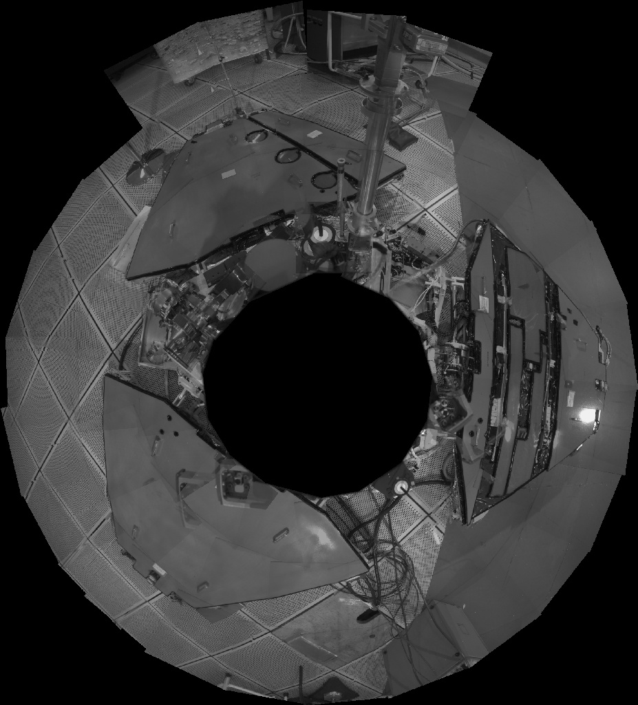This is a panoramic picture of the Mars Pathfinder lander. The image was made by the IMP during a test at the Jet Propulsion Laboratory in Pasadena, California. If you look closely, you can see some of the "tiles" which have been put together to make the entire picture.