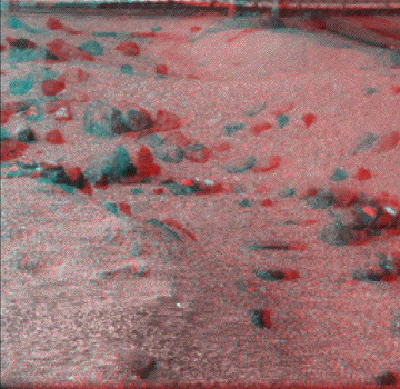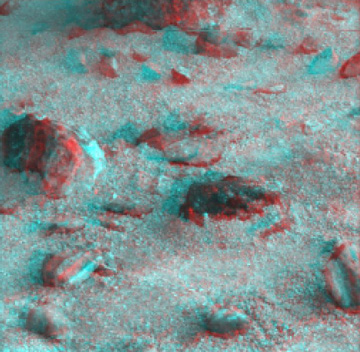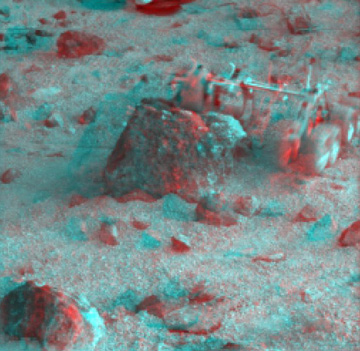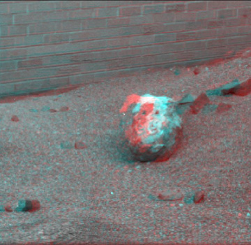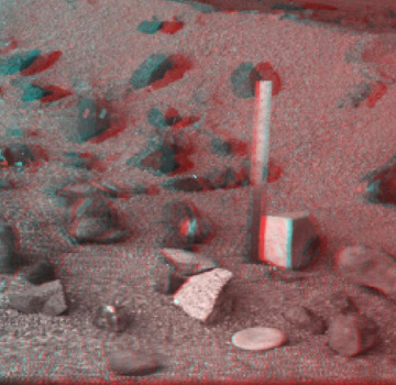 These images are "stereo." They show depth of field, but to see them in "3D" you must have stereo glasses -- glasses with a blue right lens and a red left lens. They were taken by the IMP in a test setting. Stereo images of the landing site will be used to generate a contour map of the area.