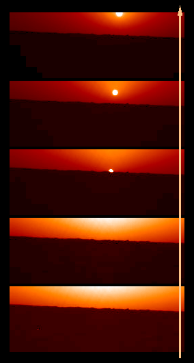 color time-lapse sequence of the Martian sunrise - the arrow indicates