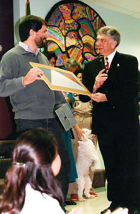 Finally, on November 28th, Brian Cooper arrived from JPL, Governor Lowry arrived from Portland, Representative Dave Schmidt from the 44th District, Bill Stevens from the Department of Licensing, and Brad Ray from the State Patrol. 680 students watched as 28 fellow students shared their research about Mars, the Pathfinder mission and the Solar System. For one full hour Cedar Wood Elementary students were captivated. The culminating activity was the administration of the drivers test. Along with students Tyler Mitchell and Taya Stenson they administered the test to Mr. Cooper. He passed with flying colors. All dignitaries signed the license, and students Tiffany Vanskaik, ashley Johnson and Lindsey Johnson presented the license to Mr. Cooper for display at JPL during the Pathfinder Mission to Mars.
