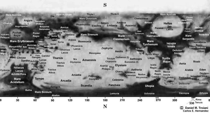 A new map of Mars based upon Dan Troiani's 1995 map of Mars based on A.L.P.O. observations (including CCD images). Added are the names of the major albedo features as well as those of minor albedo features which are often reported.