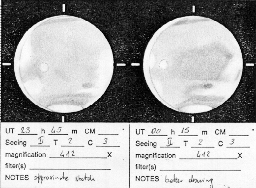 I obvious. Mare Sirenum at South limb. Two bright clouds at prec. limb.