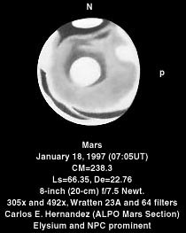 This drawing of Mars was made on January 18, 1997 at 07:05 UT (CM=238.8, Ls=66.35, De=22.76) by Carlos E. Hernandez (ALPO Mars Recorder) using an 8-inch (20-cm) f/7.5 Newtonian reflector at 305x and 492x as well as Wratten 23A (light red) and 64 (blue-green) filters. The North Polar Cap (NPC) is brilliant (10/10) , large in extent, and no detail is noted within it at this time. The NPC is surrounded by a dark (3/10) collar consisting of Scandia, Panchaia, and Utopia (preceding to following order). Casius is visible as a dark (3/10) wedge extending north over Aetheria from Utopia. The Propontis complex (Castorius Lacus and Propontis II; at times also including Euxinus Lacus and Propontis I to the south) is visible as a dark (3/10), elongated albedo feature preceding the central meridian (CM) south of the NPC collar. A dusky (4/10) "bar-like" albedo feature is noted over Cebrenia north of Elysium as it appears to connect to Morpheos Lacus. Elysium is prominent (8/10) on the CM enclosed by the Elysium complex, or pentagon, consisting of Trivium Charontis-Cerberus (3-4/10) to the southeast(or south-preceding (Sp.)), Phlegra-Styx (3-4/10) to the east (or preceding (p.)), Hecates Lacus-Chaos-Morpheos Lacus (p. to f., 3-4/10)) to the north, the Hyblaeus extension (3/10) to the northwest (or north-following (Nf.)), and Eunostos I to the southwest (or south-following (Sf.)). A very bright (8-/10) orographic (or mountain-associated) cloud is noted over Arcadia apparently connected to a extremely bright (9/10) evening limb haze (ELH), or terminator. Mare Cimmerium appears as a dark (3/10), elongated wedge towards the southern limb p. the CM apparently separated from a dark (3/10) Mare Tyrrhenum, f. the CM, by a bright (7/10) Hesperia. Syrtis Major appears as a dark (3/10) "bar-like" albedo feature within an extremely bright (9/10) morning limb haze (MLH), or following (f.) limb. The southern limb appears to be covered by an extremely bright (9/10) haze.