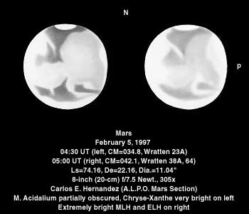 The blue (Wratten 38A) and blue-green (Wratten 64) image on the right shows a brilliant NPC surrounded by a dusky to dull (4-5/10) collar, as described above, as well as Mare Acidalium appearing dusky to shaded (4-6/10) with a very bright (8/10) strip across it's mid-section appearing to nearly bisect it. Sinus Meridiani and a portion of Sinus Sabaeus appear dull (5/10) towards the Sp. limb surrounded by a very bright (8/10) haze over Deucalionis Regio and Thymiamata. Margaritifer Sinus appears dull (5/10) whereas Mare Erythraeum appears dusky (4/10). An extremely bright (9/10) morning limb haze (MLH) is noted appearing to connect to a bright to bright to extremely bright (7-9/10) Chryse-Xanthe region. The southern limb haze (SLH) appears extremely bright (9/10).