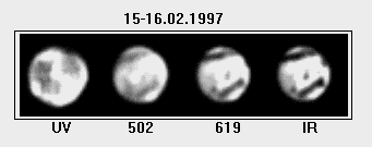 CCD images obtained from the 1-m telescope at Alma-Ata Observatory, Kazakhstan, by Academicians Victor Tejfel, Vladimir Vdovichenko, and colleagues, as part of the International Amateur-Professional Marswatch project. These images have great value because of the location of Alma-Ata Observatory halfway around the world from most of the U.S. Marswatch observers. Thus, they cover the opposite hemisphere of Mars as images on the same night in the Western hemisphere, allowing full global coverage to be obtained by combining the data sets.