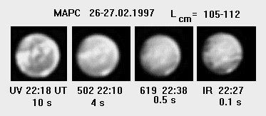CCD images obtained from the 1-m telescope at Alma-Ata Observatory, Kazakhstan, by Academicians Victor Tejfel, Vladimir Vdovichenko, and colleagues, as part of the International Amateur-Professional Marswatch project. These images have great value because of the location of Alma-Ata Observatory halfway around the world from most of the U.S. Marswatch observers. Thus, they cover the opposite hemisphere of Mars as images on the same night in the Western hemisphere, allowing full global coverage to be obtained by combining the data sets.