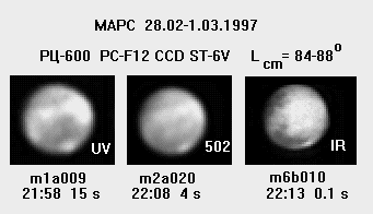 CCD images obtained from the 1-m telescope at Alma-Ata Observatory, Kazakhstan, by Academicians Victor Tejfel, Vladimir Vdovichenko, and colleagues, as part of the International Amateur-Professional Marswatch project. These images have great value because of the location of Alma-Ata Observatory halfway around the world from most of the U.S. Marswatch observers. Thus, they cover the opposite hemisphere of Mars as images on the same night in the Western hemisphere, allowing full global coverage to be obtained by combining the data sets.