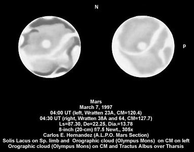 The red light (Wratten 23A) drawing of Mars on the left was made on March 7, 1997 (LS=87.30, De=22.25) at 04:00 UT (CM=120.4) by Carlos E. Hernandez (A.L.P.O. Mars Coordinator) using an 8-inch (20-cm) f/7.5 Newtonian reflector at 305x. The North Polar Cap (NPC) appears small and brilliant (10/10) apparently surrounded by a dark to dusky (3-4/10) collar consisting of Baltia, Mare Boreum, Abalos, Nerigos, Ierne, and Scandia. Mare Acidalium (f. or western border) appears dark on the p. limb, or terminator, with an extremely bright (9/10) strip (at the level of Achillis Pons) apparently connecting to a very bright extended strip (Tractus Albus) over the Tempe-Tharsis-Mesogaea-Zephyria region. A very bright (8/10) orographic cloud is visible over Tharsis on the CM most probably associated with Olympus Mons. The Propontis Complex (Propontis I and II as well as Castorius Lacus; at times including Euxinus Lacus) is visible towards the Nf., or morning, limb as a dark (3/10) albedo feature with the Phlegra-Styx region (3-4/10) Sf. it as well the Trivium Charontis-Cerberus (I) region (3/10). Elysium appears extremely bright (9/10) on the f., or morning, limb. Niliacus Lacus and Idaeus Fons appear dark (3/10)on the p. limb apparently connecting to a dusky (4/10) Nilokeras which connects to a dark (3/10) Lunae Lacus which then connects to a dull (5/10) Ganges (these albedo features appear to enclose an extremely bright Chryse-Xanthe region). Solis Lacus appears dark (3/10) on the Sp. limb apparently separated from A dark (3/10) Mare Sirenum by a very bright (8/10) strip over the Daedalia-Claritas region. Araxes appears dusky (4/10) extending from the p. end of Mare Sirenum over southern Tharsis. An extremely bright (9/10) SLH is visible. An extremely bright (9/10) MLH is visible as well.