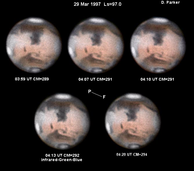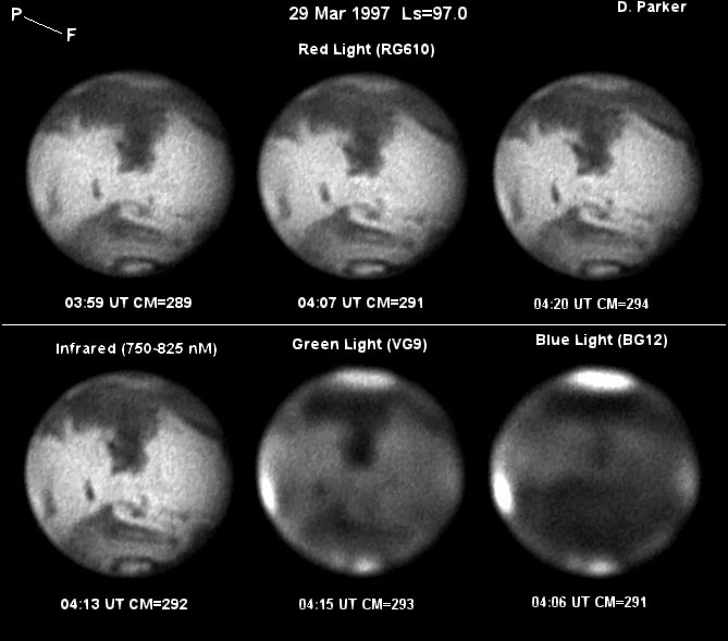 Images dp_mar-29.jpg and dp_mar-29bw.jpg were taken by Don Parker, Coral Gables, Florida (USA). He uses a Lynxx PC camera, 16-in (41cm) Newtonian. Eyepiece projection is at f/49.3. Integration times are as follows (NOTE: Seeing variable (6-7), high haze (T=3.5-4m)):