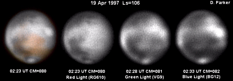Image dp_apr-19.jpg was taken by Don Parker, Coral Gables, Florida (USA). He uses a Lynxx PC camera, 16-in (41cm) Newtonian. Eyepiece projection is at f/47.8. Integration times are as follows (NOTE: Post front, seeing very poor 3-4 . No wind):