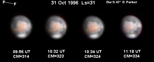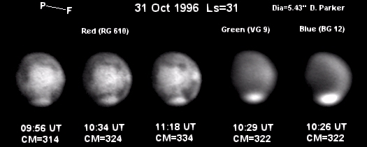 Images dp_oct-31bw.jpg (47K) and dp_oct-31.jpg (47K) are the third in a series of images taken by Don Parker, Coral Gables, Florida (USA). He uses a Lynxx PC camera, 16-in (41 cm) Newtonian. Eyepiece projection is at f/50.7 for these images. Integration times are as follows: