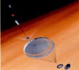 Deployment of the single, 24-ft. diameter parachute occurs 2-3 min. after atmospheric entry at an altitude of 5-11 km. (3-7 mi.) above the surface, eventually slowing the vehicle down to 65 meters/sec. The parachute is similar in design to those used for the Viking program but has a wider band around the perimeter which helps minimize swinging.