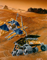 The above artist's rendition shows the Pathfinder lander in its final configuration on the surface of Mars. The rover in the foreground is deployed off one of the petals. The upper surface of each petal is a solar panel which provides the Pathfinder spacecraft with its power. The rover is powered by a solar array on the top surface of the rover.