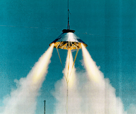 At approximately 17:07:12 three solid propellant rockets on the inner surface of the back shell fire which further slow down the descent rate of the lander. Each solid rocket motor consumes 30.7 kg of propellant over a period of 2.2 seconds, generating a thrust of 7,938 newtons. The decent rate is slowed down from a rate of 58 meters per seconds, or 130 miles per hour, to a descent rate of less than 20 meters per second. The above picture is an artist's rendition from a vantage point above Pathfinder looking down on the landing site.