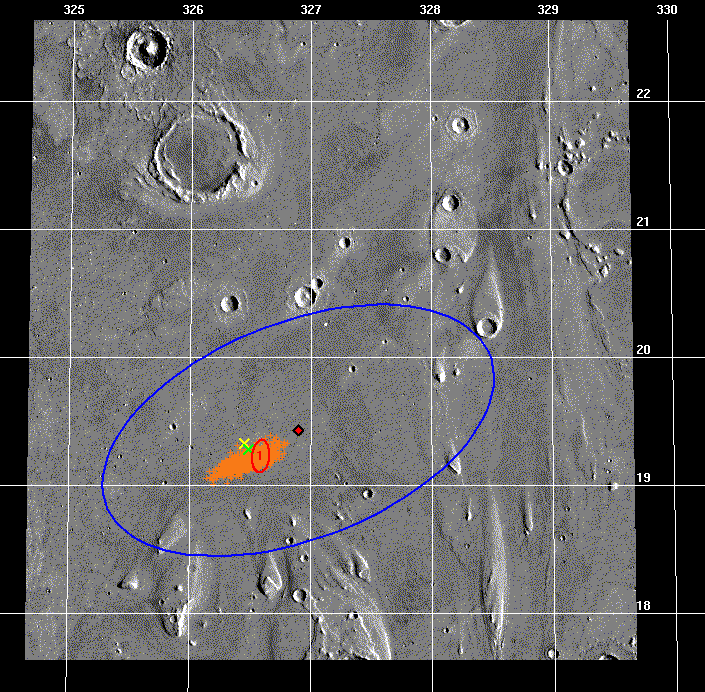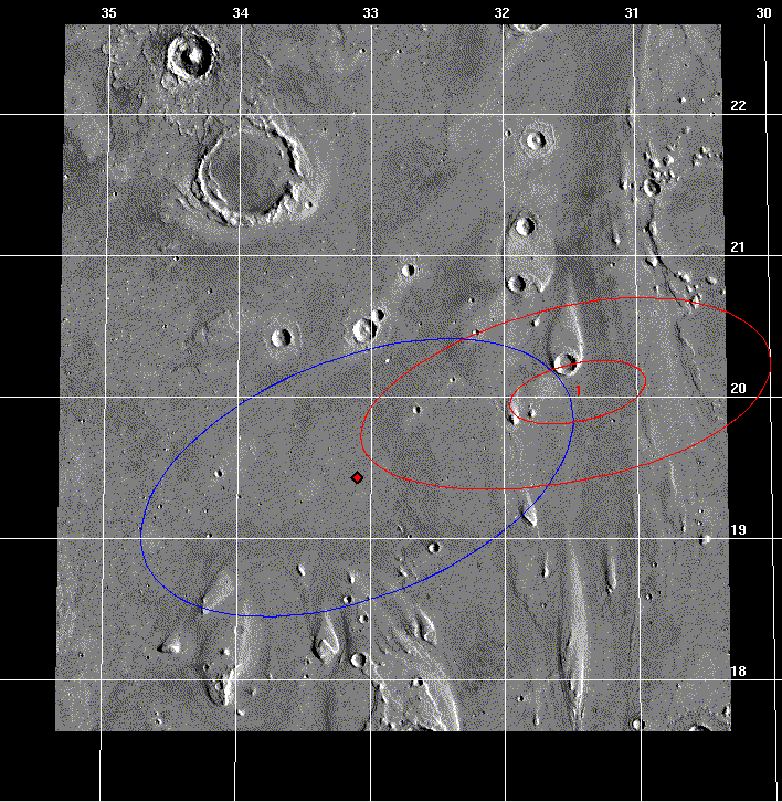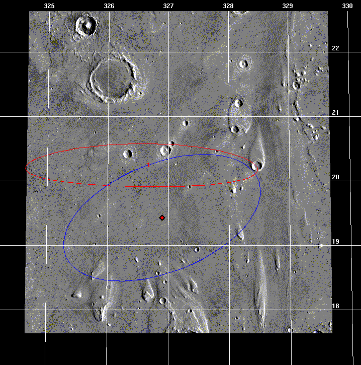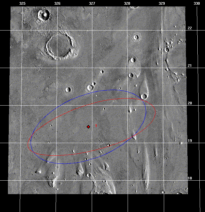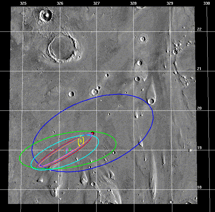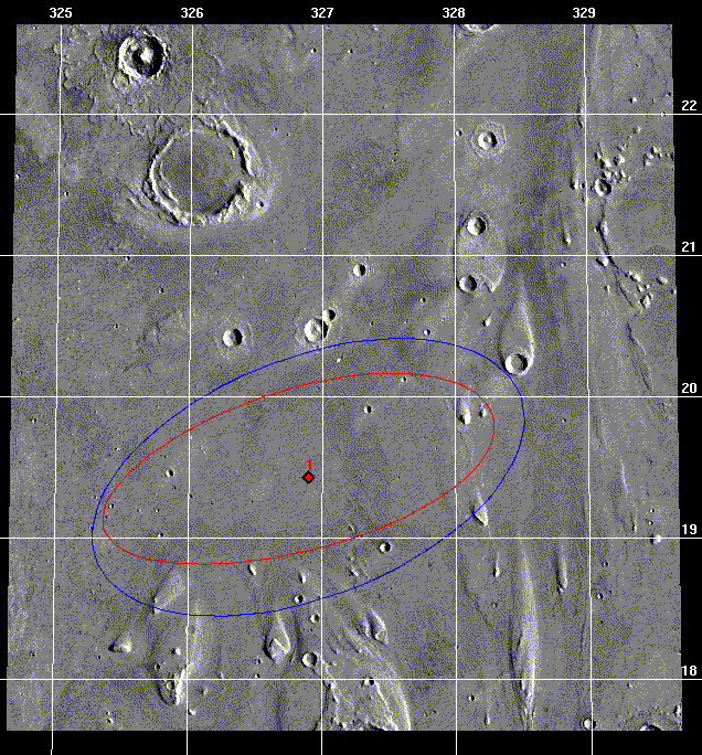 For this solution done in May 1997, we were still pretty far away from Mars and our trajectory uncertainty was rather large when mapped to the surface. So I chose to display a "1-sigma" ellipse which (mostly) fits within the bounds of the image and is 227 x 40 km (141 x 25 mi) in size. For the 1-sigma case, we had roughly a 39% chance of landing inside the red ellipse. This ellipse was centered at 20.24 deg N latitude and 33.32 deg W longitude - slightly off the target landing site since TCM 3 did not execute perfectly. Compare this to the latest image above where the current 1- and 3-sigma ellipses are shown. (See the ellipse shrunk and moved around just like I promised!)