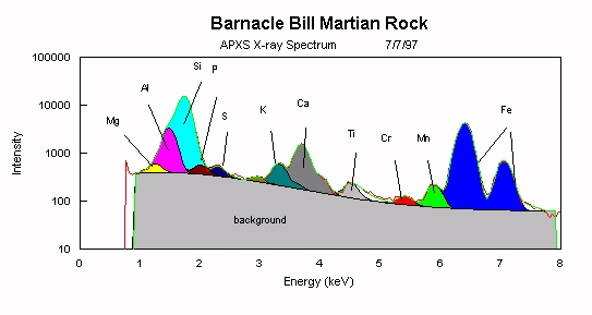 X-ray spectrum of the first measured Martian rock A-3 "Barnacle Bill" with the APXS instrument. This rock is high in silica as compared to the average Martian soil.