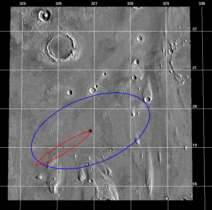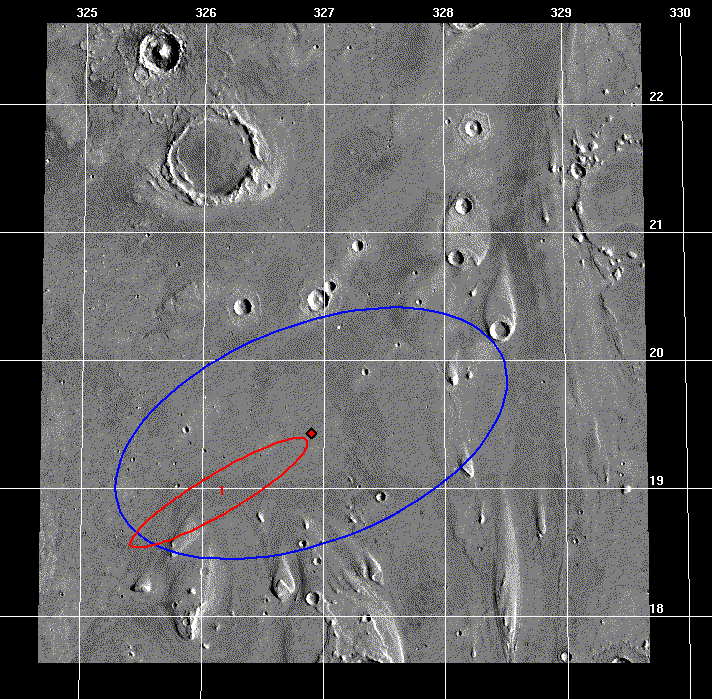 This image shows the MPF landing site area on Mars. The blue ellipse is the target 200x100 km landing region. The red diamond in the middle of this ellipse is the target landing site. The red ellipse to the southwest of the blue ellipse is the current navigation estimate of where the spacecraft will land if we do nothing. It is centered at 18.98 deg N, 326.17 deg E (33.83 deg W) and is 97.6 x 14.3 km in size. This is within the target zone and indicates that TCM 5B is not required. The flight team has decided NOT to execute TCM 5B unless there is some large movement in the navigation solutions in the next 2 hours. (This is very unlikely - our solutions have been "landing" on the same spot for the past 24 hours.)
