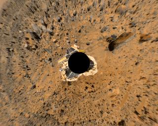 This image is one frame of an animation that was created by using two mosaics: a color image of the Gallery Pan and an image which indicates the distance to the nearest object at each pixel location, referred to as a range image. The range data set is treated as a displacement map with respect to a sphere's surface, and the color image mosaic is draped onto the inside of the sphere. The position of the camera is fixed at the sphere's center, while its viewing direction is in this case looking at the south pole of the sphere. The mosaics were projected onto a continuous cylindrical/perspective coordinate system spanning 360 degrees of azimuth. The distortion visible near the edges of this image is due to the large field of view, as well as the limitation introduced by using cylindrically-projected images on the sphere - the effects of which are less apparent when smaller fields of view are used. The image has been rotated so that the main points of interest, which are the 'Rock Garden', the rover Sojourner and the rock 'Yogi', are easily seen arching across the upper hemisphere. In fixed Mars Surface coordinates, the top of the image looks out towards a point a few degrees north of West. Color has been enhanced to improve contrast in features, and is derived from IMP spectral filters 5, 9 and 0.