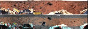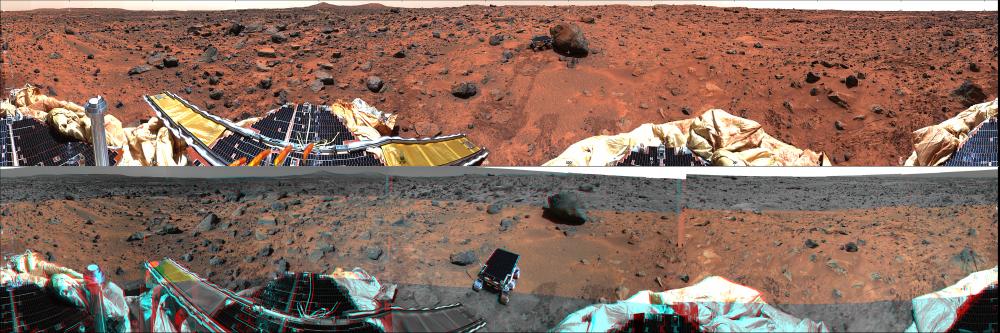 BOTTOM IMAGE: Anaglyphic stereoimage created from the 'monster pan' sequence, acquired in four sections between about 8:30 and 15:00 local solar time on sol 3. Mosaics of images obtained through the 670 nm filter (left camera) and 530 and 440 nm filters (right camera) were used where available. At the top and bottom, left- and right-camera 670 nm images were used. Part of the northern horizon was not imaged because of the tilt of the lander. This image may be viewed stereoscopically through glasses with a red filter for the left eye and a cyan filter for the right eye.