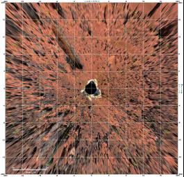 TOP IMAGE: Enhanced true-color image created from the 'Gallary Pan' sequence, acquired on sols 8-10 so that local solar time increases nearly continuously from about 10:00 at the right edge to about 12:00 at the left. Mosaics of images obtained by the right camera through 670 nm, 530 nm, and 440 nm filters were used as red, green and blue channels. Grid ticks indicate azimuth clockwise from north in 30 degree increments and elevation in 15 degree increments.