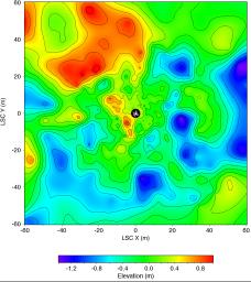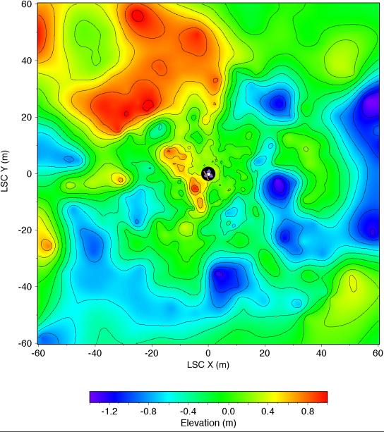 Topographic map of the landing site, to a distance of 60 meters from the lander in the LSC coordinate system. The lander is shown schematically in the center; 2.5 meter radius circle (black) centered on the camera was not mapped. Gentle relief [root mean square (rms) elevation variation 0.5 m; rms adirectional slope 4O] and organization of topography into northwest and northeast-trending ridges about 20 meters apart are apparent. Roughly 30% of the illustrated area is hidden from the camera behind these ridges. Contours (0.2m interval) and color coding of elevations were generated from a digital terrain model, which was interpolated by kriging from approximately 700 measured points. Angular and parallax point coordinates were measured manually on a large (5m length) anaglyphic uncontrolled mosaic and used to calculate Cartesian (LSC) coordinates. Errors in azimuth on the order of 1O are therefore likely; elevation errors were minimized by referencing elevations to the local horizon. The uncertainty in range measurements increases quadratically with range. Given a measurement error of 1/2 pixel, the expected precision in range is ~ 0.3 meter at 10 meter range, and ~ 10 meters at 60 meter range. Repeated measurements were made, compared, and edited for consistency to improve the range precision. Systematic errors undoubtedly remain and will be corrected in future maps compiled digitally from geometrically controlled images. Cartographic processing by U.S. Geological Survey.