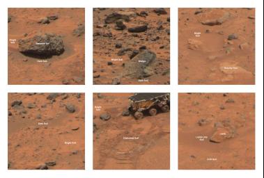 Type areas of rocks and soils. (A) Dark rock type and bright soil type: Shown is the dark rock Barnacle Bill. Reflectance spectra typical of fresh basalt and APXS spectra indicating more silica- rich basaltic andesite compositions characterize this type. These rocks are typically the small boulders and intermediate-sized cobbles at the Pathfinder site. The bright soil type is very common and in this case comprises Barnacle Bill's wind tail and much of the surround soil area. This soil has a high reflectance and a strongly reddened spectrum indicative of oxidized ferric minerals. (B) Bright rock type: Shown is the bright rock Wedge. Reflectance spectra typical of weathered basalt and APXS spectra indicating basaltic compositions characterize this type. These rocks are typically larger than 1 meter in diameter and many display morphologies indicating flood deposition. (C) Pink rock type: Shown is the pink rock Scooby Doo. APXS and reflectance spectra indicate a composition and optical characteristics similar to the drift soil. However, the morphology of the pink rock type indicates a cemented or rocklike structure. This material may be a chemically cemented hardpan that underlies much of the Pathfinder site. (D) Dark soil type: The dark soil type is typically found on the windward sides of rocks or in rock- free areas like Photometry Flats (shown here) where the bright soil has been striped away by aeolian action or in open areas. Other locations include the Mermaid Dune. (E) Disturbed soil type: The darkening of disturbed soil relative to its parent material, bright soil, as a result of changes in soil texture and compaction caused by movement of the rover and retraction of the lander airbag. (F) Lamb-like soil type: This soil type shows reflectance and spectral characteristics intermediate between the bright and dark soils. Its distinguishing feature is a weak spectral absorption near 900 nanometers not seen in either the bright or dark soils.