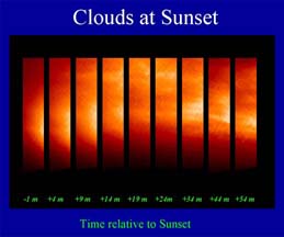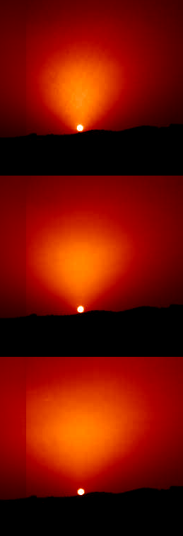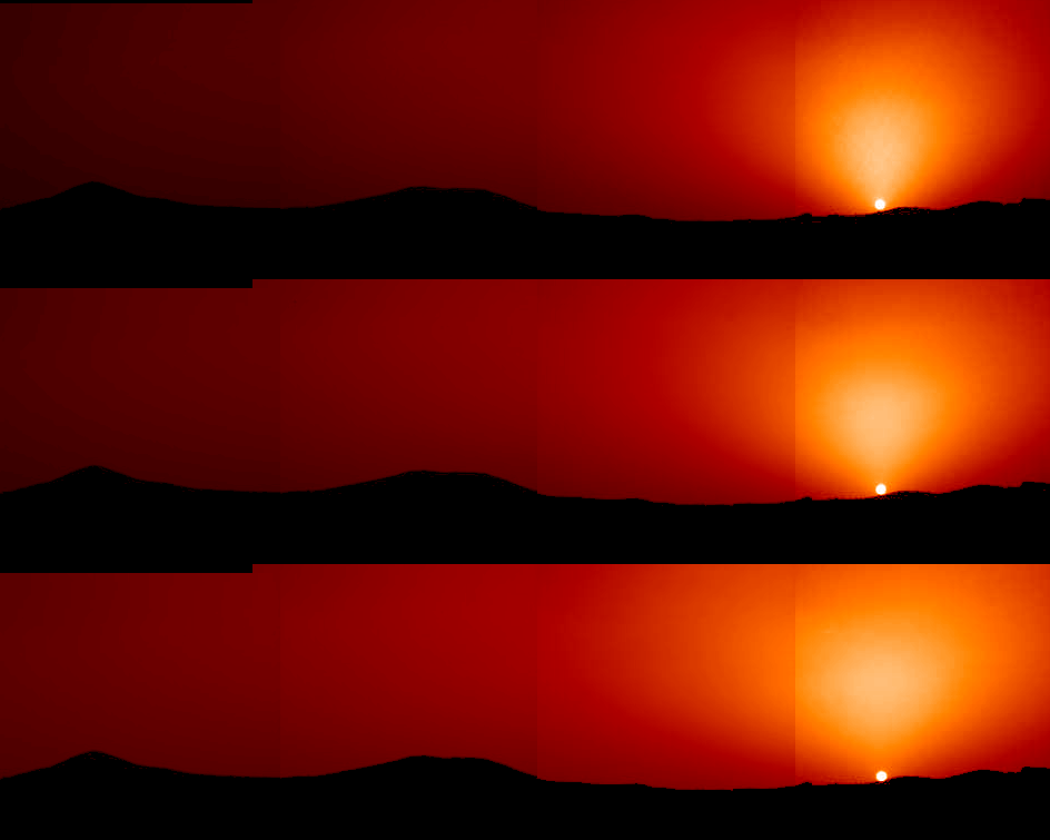 | A detail of the sunset showing a fan-shaped scattering of light. | Stills of the sunrise with false color. |