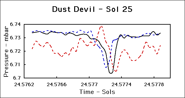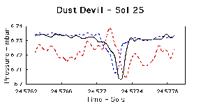 to fall. As the dust devil passes over the lander, pressure begins to rise,