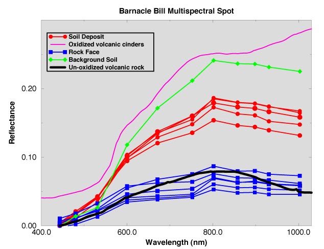 deposit is intermediate to that of the background soil and rock face spectra.