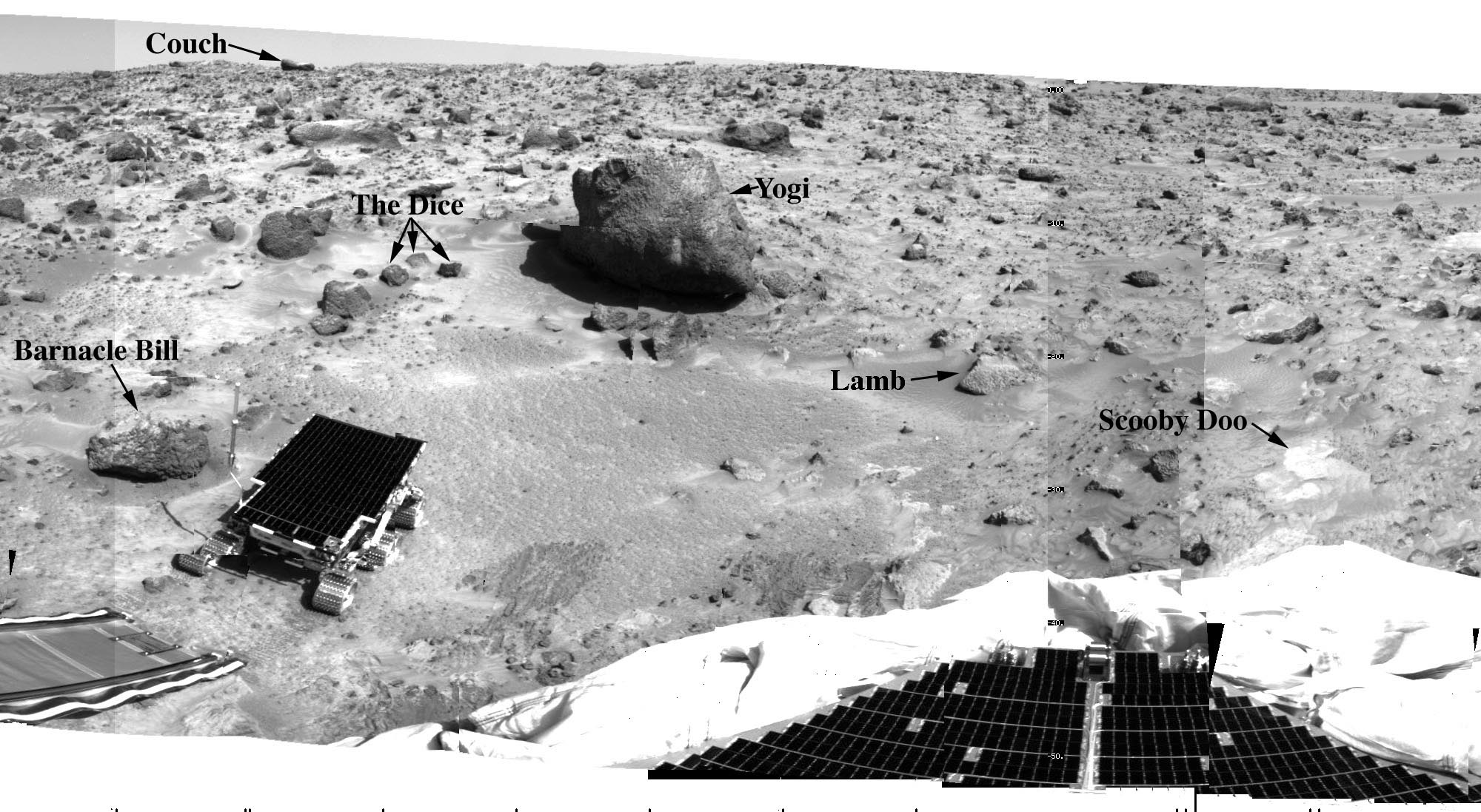 This portion of the "monster panorama" shows some of the unofficial names that have been applied to rocks at the Pathfinder landing site. Barnacle Bill, Yogi, Scooby Doo, and Lamb have been investigated by the Sojourner rover and its Alpha Proton X-Ray Spectrometer. Couch is a large rock on the horizon. The names are used by the Pathfinder team to help identify and keep track of the many rocks at the landing site. |