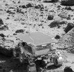 | The best image of the Sagan Memorial Station taken to date by the Sojourner Rover. Looking out from the Rock Garden, the camera mast and High Gain Antenna can clearly be seen above the American flag and Jet Propulsion Laboratory logo... | ...And in return, the lander took this image of Sojourner on her way to the rock named Shark. |