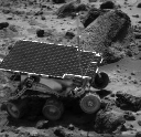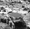 This image taken on Sol 37 shows the Sojourner rover backed next to the