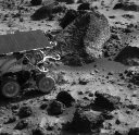 Sojourner rover between the rocks "Wedge" (foreground) and "Shark"(behind