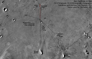 Sojourner used to descend to the Martian surface is at lower left, and a