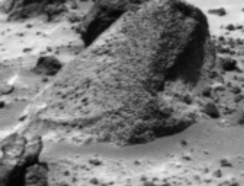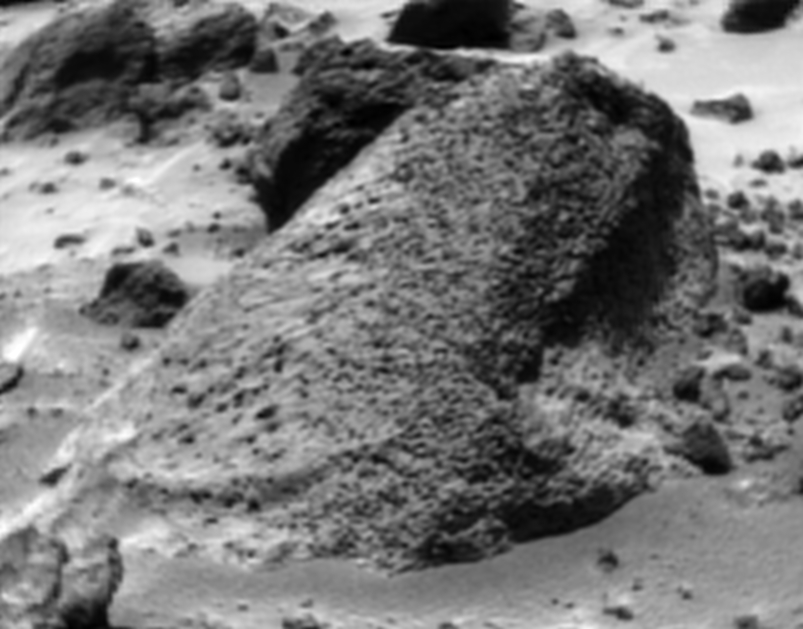 super-res-result.jpg (202K) This enhanced image of the nearby rock named Wedge is the result of combining 25 nearly-identical images taken by the IMP camera, using a technique called super-resolution developed at NASA Ames Information Sciences Division by Peter Cheeseman, Bob Kanefsky, Robin Hanson, and John Stutz. |