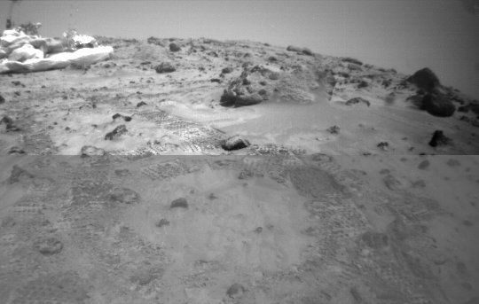 | sol21-3.jpg | 540X343 44KB | SOL21 Rover B&W image of Souffle rock | sol21-4.jpg | 540X343 49.4KB | SOL21 Rover B&W image tracks by Souffle rock |