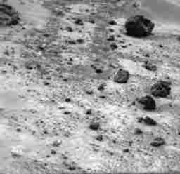 | sol4-13.jpg | 258X242 31.6KB | SOL4 Rover rear image of end of Yogi rock; B&W | sol4-15.jpg | 255X249 32.5KB | SOL4 Rover image of rover tracks by Yogi rock; B&W |