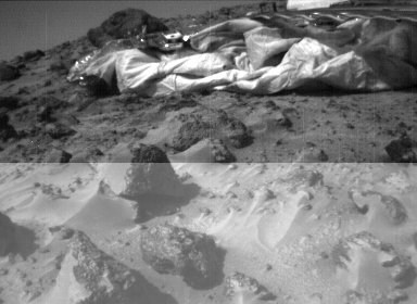 | sol35-1.jpg | 384X280 25.2KB | SOL35 Rover B&W image of lander airbags | sol35-2.jpg | 540X343 52KB | SOL35 Rover B&W Wedge on left Flattop on right |