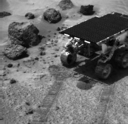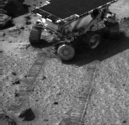 | sol12-7.jpg | 256X248 12.8KB | SOL12 IMP B&W of left side of rover | sol12-8.jpg | 256X248 12.7KB | SOL12 IMP B&W Sojourner and wheel tracks |