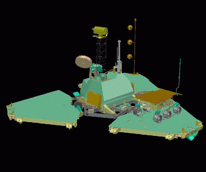 | sol6-1.jpg | 768X480 265KB | SOL6 Rover left front camera image w/ Lander; B&W | sol6-2.jpg | 256X248 33.5KB | SOL5 IMP image of rover with wheels turned; B&W |