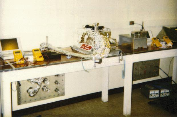 Our decision was to replace the plastic connectors with discrete wires, replace the commercial bracket of the radios with a more rugged stainless steel one, replaced the commercial outer metallic box with a wrap made out of layers of fiber glass tape and aluminum tape, and replace the commercial BNC RF connector with an SMA connector. These modifications were done on eight radios. Remember we needed a minimum of eight radios for: Microrover Flight radio and its spare, a Lander radio and its spare, two radios for qualification environmental tests, a Rover SIM and its spare. The SIM Rover is named Marie Currie and is an exact replica of Sojourner. We keep Marie Currie here on Earth for mission operations simulations in the Mars Pathfinder testbed. We did a series of preliminary electrical screening tests to select the eight top-performing radios, to be modified into space-flight hardware. We simply did not see the need to modify anymore radios, especially when these modifications were costing both time and money, both of which we did not have plenty of.